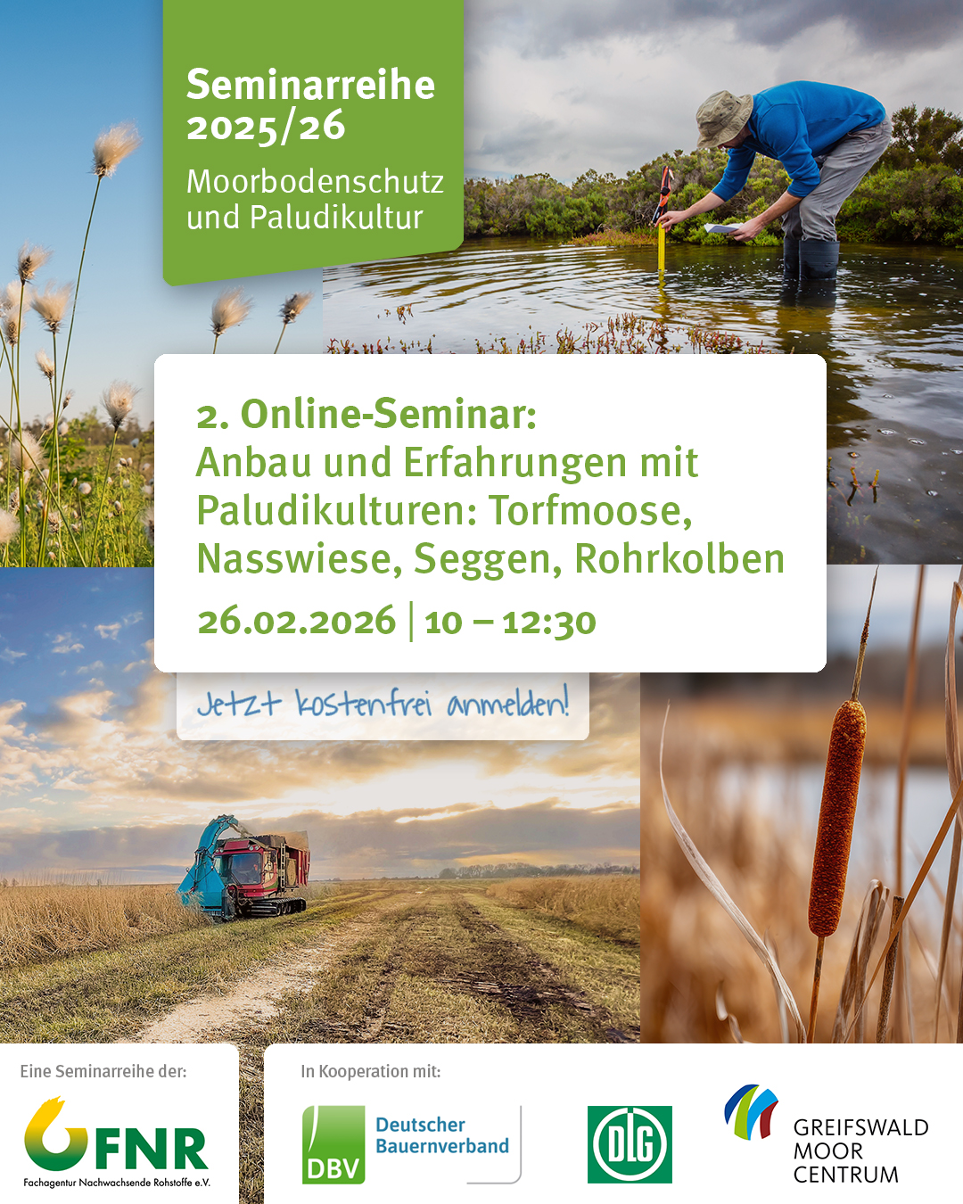 14/02/2026 Am 26. Februar 2026 bieten FNR und Greifswald Moor Centrum ein weiteres Webinar in der kostenfreien Onlinereihe "Moorbodenschutz und Paludikultur". Von 10.00 – 12.30 Uhr geht es um "Anbau und Erfahrungen mit Paludikulturen: Torfmoose, Nasswiese, Seggen, Rohrkolben".