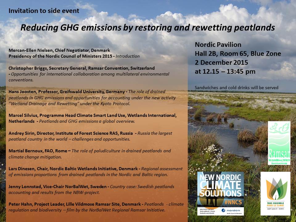 Beim UNFCCC Side event “Reducing GHG emissions by restoring and rewetting peatlands”, organisiert vom Nordic Council of Ministers (NCMR) in Paris, referiert Joosten zu „The role of drained peatlands in GHG emissions and opportunities for accounting under the new activity ’Wetland Drainage and Rewetting‘ under the Kyoto Protocol”. Hier das Programm dieses Side events am Mittwoch, 2. Dezember von 12:15-13:45 im Nordic Pavillion Hall 2B.