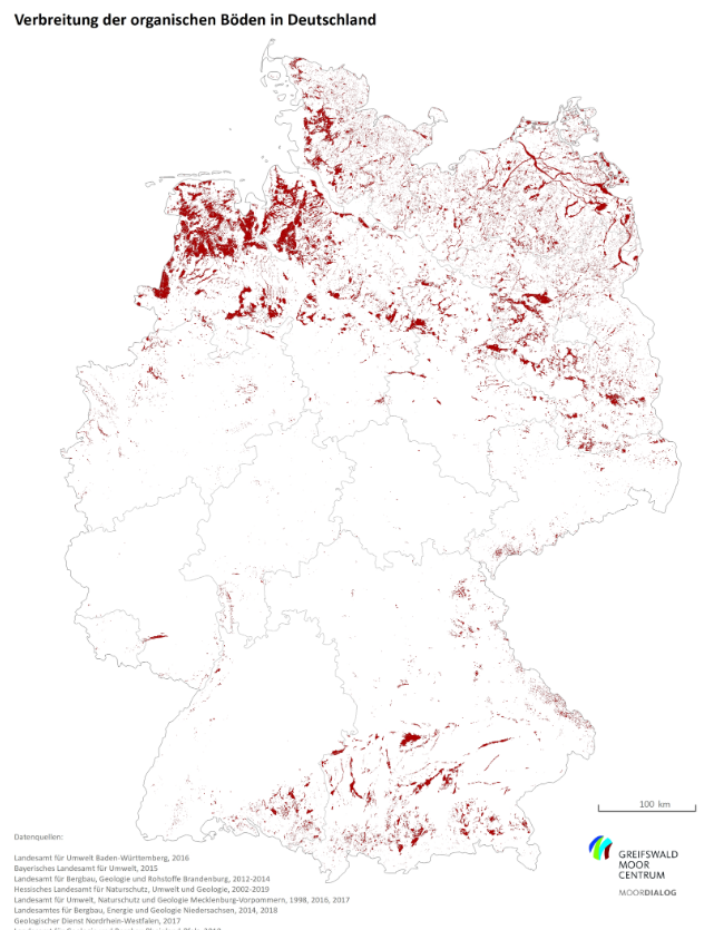 04/05/2020 Aktuelle Informationen über die Verbreitung von Mooren und Anmooren in allen Bundesländern hat das Greifswald Moor Centrum in einer neuen Karte zusammengestellt. Die Aggregierte Karte organischer Böden in Deutschland ist auch als GIS-Daten-Download frei verfügbar. Ihre flächengenauen Daten zu organischen Böden in Deutschland können zum Beispiel für die Planung auch länderübergreifender Klima- und Naturschutzmaßnahmen in Mooren genutzt werden. Die Karte hat das Greifswald Moor Centrum im MoorDialog-Projekt mit Hilfe der zuständigen Verwaltungseinrichtungen der einzelnen Bundesländer zusammengetragen. Sie ist als erstes Band der Greifswald Moor Centrum-Schriftenreihe im Jahr 2020 erschienen.