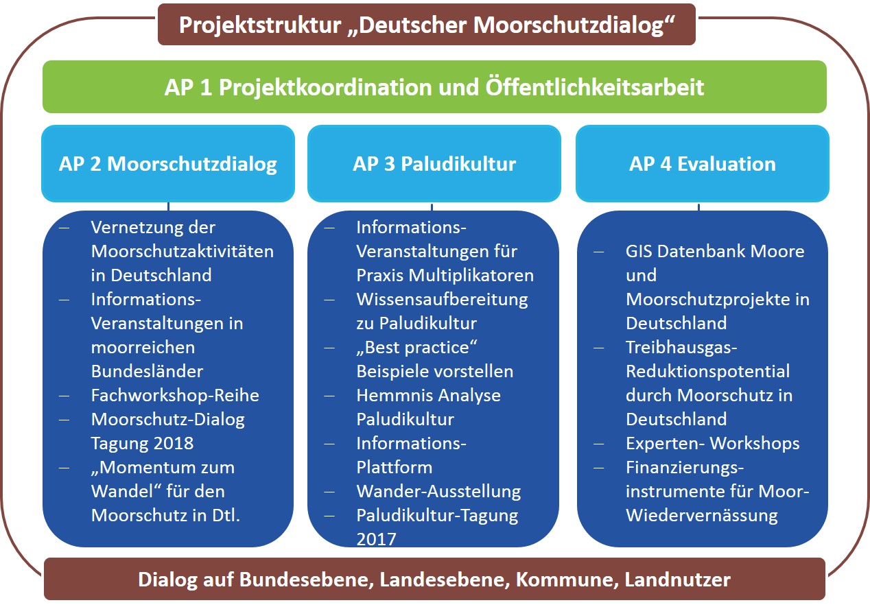 Durch Vernetzen von Akteur*innen, zielgerichtete Kommunikation und Wissenstransfer vermittelt dieser Dialog, welche Bedeutung Moore bei der Reduktion von Treibhausgasemissionen spielen - und welchen Beitrag sie zu den Klimaschutzzielen der Bundesregierung leisten können. Auf Bundes-, Landes- und Kommunalebenen soll er Aktivitäten und Akteur*innen zu Klimaschutz durch Moorschutz zusammenführen und der Öffentlichkeit, insbesondere Multiplikator*innen aus Kommunen, Wirtschaft und Gesellschaft, entsprechende Information verfügbar machen. Weiterhin evaluiert das Projekt bereits erzielte und zukünftig realistische Reduktionen von Treibhausgasemissionen durch Moor-Wiedervernässung und klimaschonende, produktive Moornutzung (Paludikultur).