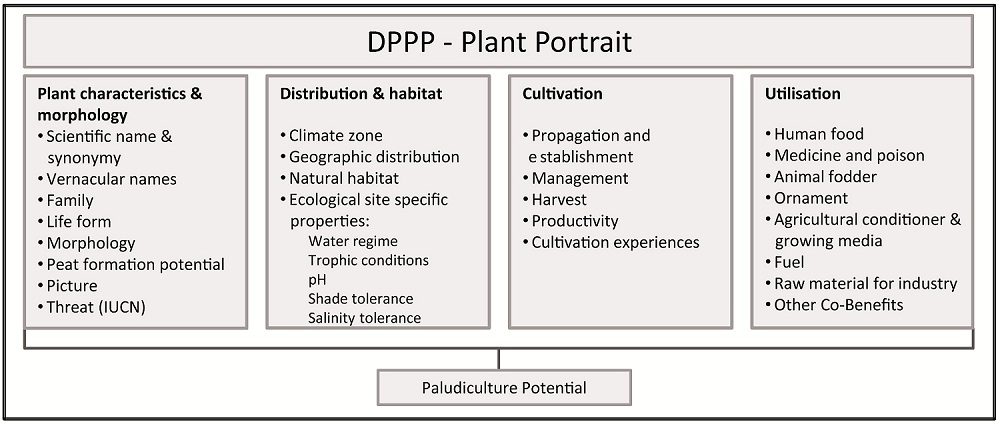 Die DPPP verzeichnet konventionelle Nutzpflanzen, die unter nassen Bedungungen wachsen können (z.B. Cranberry, Reis, Wildreis), sowie typische Moorpflanzen, die nach möglicher Nutzbarkeit analysiert wurden (z.B. Sphagnum, Ledum palustre). Ebenso enthält die Datenbank Arten, die bereits erfolgreich in Paludikultur genutzt werden.