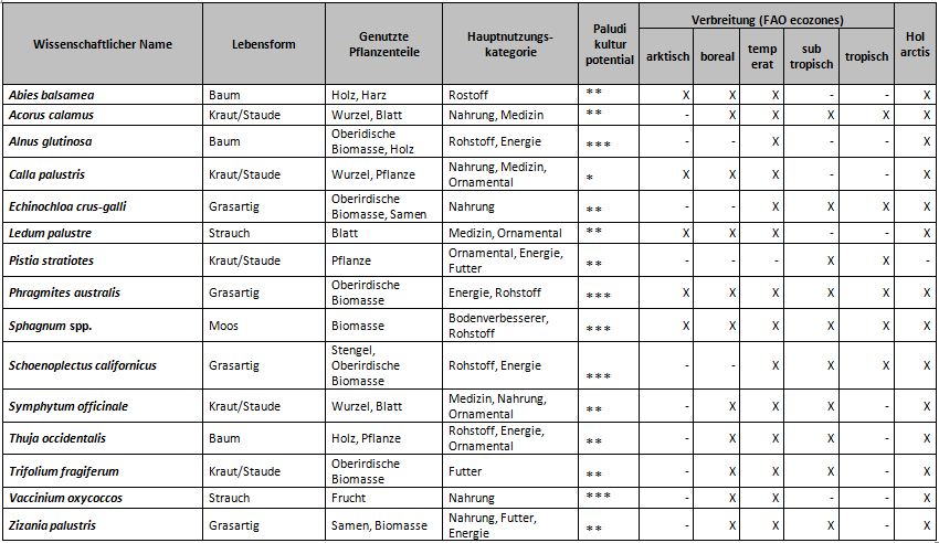 Vorangegangen war eine Literatursuche sowohl in primären (Zeitschriften, Bücher, Proceedings etc.) als auch sekundären Quellen (Abstracts, Internet-Ressourcen, Datenbanken und andere bibliographische Tools). Eng verwandte Arten mit ähnlichen Eigenschaften und Einsatzmöglichkeiten sind als Gruppen in der DPPP zusammengefasst, z.B.Sphagnum spp., Carex spp. oder Salix spp. Die DPPP gibt damit einen globalen Überblick über nutzbare Feuchtgebietspflanzen und deren Verwendungsmöglichkeiten, hier ein Auszug.