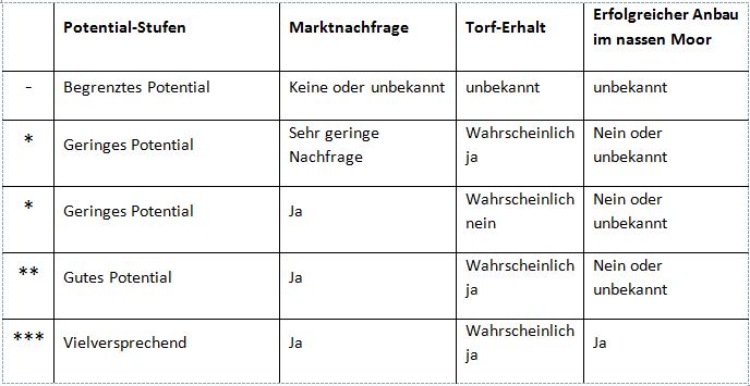 Um das Paludikultur-Potential einer Pflanze besser zu bestimmen, definiert die DPPP vier Abstufungen basierend auf drei Kriterien: Erhalt des Torfbodens, Marktnachfrage der Biomasse und Implementierung einer bereits vorhandenen Paludikultur. Da der Erhalt des Torfes das Hauptanliegen von Paludikultur ist, ist die Ernte der unterirdischen Pflanzenorgane nicht erstrebenswert da dabei der Torfboden gestört werden würde. Das Marktpotential basiert auf einer groben Internet- und Literaturrecherche, wobei die bloße Existenz eines Produktes, unabhängig von der Menge und Qualität, als Beweis für einen Markt gilt. Auch vielversprechende potentielle Märkte, z.B. für Bioenergiepflanzen, wurden berücksichtigt. Die Märkte für Bioenergiepflanzen entwickeln sich rasant, was die Suche nach mehr Nutzpflanzen antreibt.