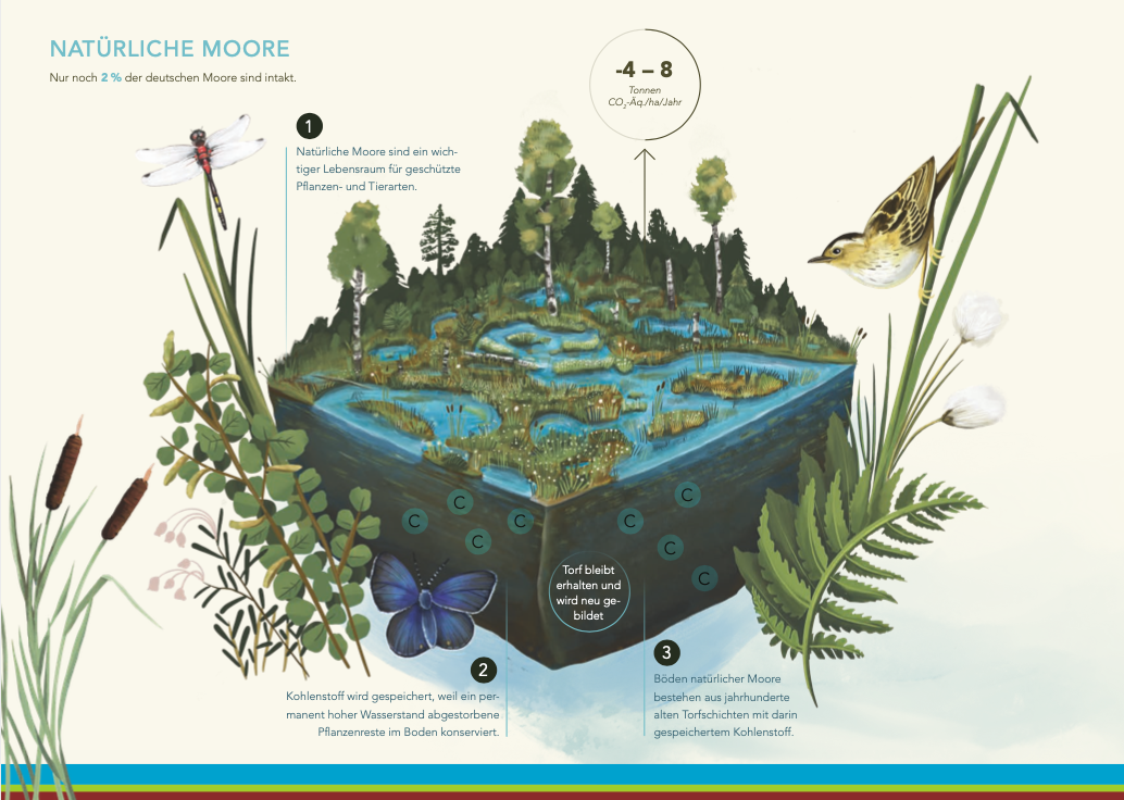 Neben ihrer Klimawirksamkeit haben nasse Moore eine große Bedeutung für die biologische Vielfalt: Moore bieten einzigartige Lebensräume für Arten, die sich an die feuchten und speziellen Bedingungen angepasst haben und sind oft die letzten naturnahen Refugien für seltene und bedrohte Arten. Nasse und wiedervernässte Moore erbringen zahlreiche weitere ökologische Leistungen für die Gesellschaft (Bonn et al. 2016), beispielsweise den Rückhalt von Schadstoffen und die Regulierung des Lokalklimas sowie des Wasserhaushalts.