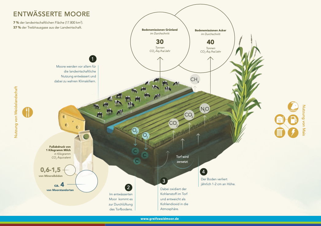 Moore nehmen nur 3% der Landfläche der Welt ein, enthalten aber in ihren Torfen – mit 500 Gigatonnen – zweimal mehr Kohlenstoff als die gesamte Biomasse aller Wälder der Erde. Wenn ein Moor entwässert wird, tritt Sauerstoff in den Torf ein, CO2 und oft auch N2O werden emittiert. Die entwässerten Moore, lediglich 0,3% der Landfläche der Welt, verursachen überproportional hohe Emissionen: Mit jährlich 2 Gigatonnen CO2 sind sie für fast 5 % der weltweiten anthropogenen CO2-Emissionen verantwortlich. Die größten Emittenten sind Indonesien, die EU, Russland, China und die USA (Joosten 2009). In Deutschland machen entwässerte Moore nur 7 % der Landwirtschaftsfläche aus. Doch sie verursachen 99% der CO2-Emissionen aus landwirtschaftlich genutzten Böden und 41% aller Emissionen aus der gesamten Landwirtschaft, einschließlich N2O aus Düngung sowie N2O und CH4 aus Tierhaltung (UBA 2021). In einem moorreichen Bundesland wie Mecklenburg-Vorpommern sind entwässerte Moore mit ca. 6,2 Millionen t CO2-Äq. pro Jahr die größte Einzelquelle für Treibhausgase (Hirschelmann et al. 2020).