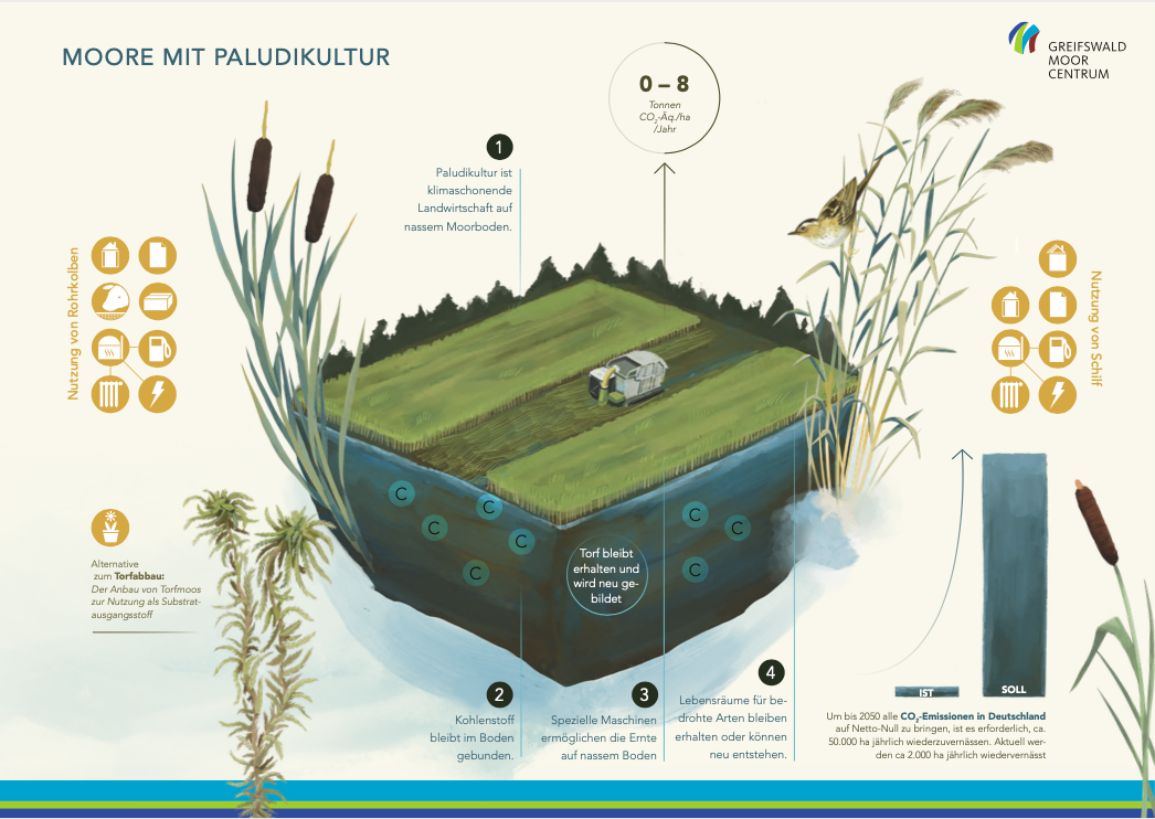 Die Wiedervernässung der Moore ist somit aus umwelt- und klimapolitischer Sicht dringend notwendig (Crump 2017, UNEA 2019). Sie sollte vielfach mit Paludikultur, d.h. der nassen Bewirtschaftung von Mooren, verknüpft werden (Joosten et al. 2012, Wichtmann et al. 2016). Diese schließt traditionelle Verfahren der Moorbewirtschaftung (z.B. Rohrmahd) ein, beinhaltet aber vor allem die Entwicklung und Umsetzung neuer Verfahren der stofflichen und energetischen Verwertung von Moor-Biomasse.