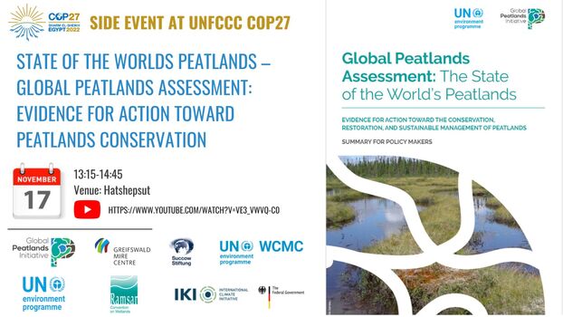 16/11/2022 A first comprehensive assessment of global peatlands will be presented in an official side event State of the Worlds Peatlands – Global Peatlands Assessment: Evidence for action toward peatlands conservation at the World Climate Summit COP27 at 17th November 2022 from 13:15-14:45 (GMT+2). The assessment includes an updated version of the Global Peatland Map compiled by the Greifswald Mire Centre (GMC) and provides latest science on peatland distribution, trends, and pressures. Most importantly, it recommends actions for the conservation, restoration, and sustainable management of peatlands, in particular for climate protection and adaptation to climate change.